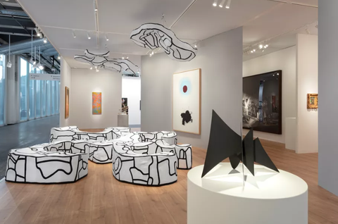 Phần trình bày rộng lớn của gallery, không thể bỏ qua trong ngày VIP của Art Basel, được tập trung quanh một tác phẩm nổi bật của hội chợ: chiếc ghế dài Banc-Salon (1970/2024) sơn đen trắng ngoằn ngoèo của Jean Dubuffet. Tác phẩm này, được trưng bày với sự hợp tác của Galerie Lelong & Co., đặt dưới hai chiếc diều bay lơ lửng của nghệ sĩ, mời người xem ngồi xuống, suy ngẫm và thư giãn trong bối cảnh hỗn loạn của Art Basel. Ba phiên bản của tác phẩm này được bán với giá 800.000 euro (khoảng 859.160 USD) mỗi phiên bản.