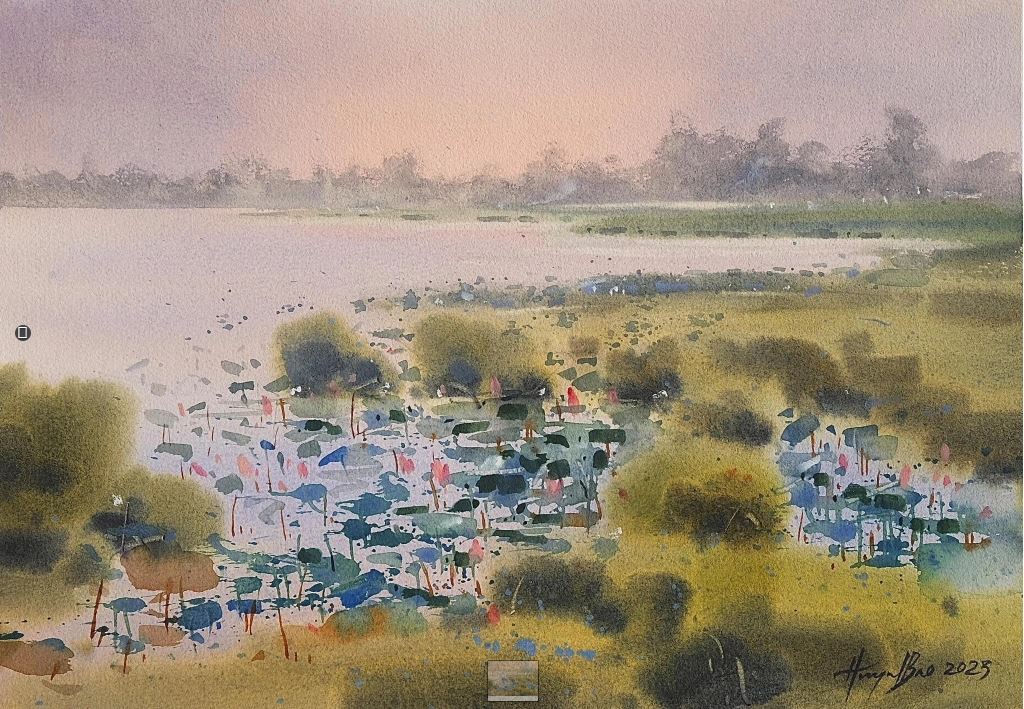 Tranh màu nước "Cánh đồng sen trong sương sớm" - Hoạ sỹ Bảo Huỳnh