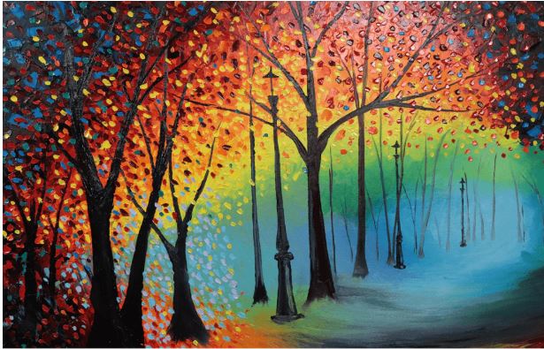 Hãy thử chơi đùa với màu sắc, ánh sáng và kết cấu để tạo ra những hiệu ứng độc đáo. Lấy cảm hứng từ phong cách của Leonid Afremov, bức tranh này mang đến không khí lãng mạn của một buổi tối đi dạo trong công viên. Bạn có muốn thử vẽ một tác phẩm như vậy không?