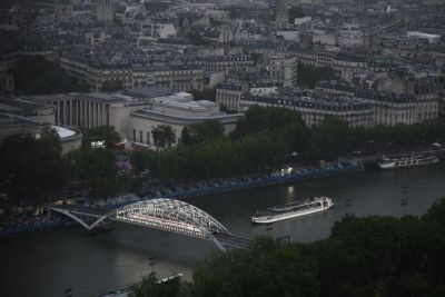 PARIS, PHÁP - NGÀY 26 THÁNG 7: Một chiếc thuyền chở các thành viên của phái đoàn Brazil đi qua cầu Passerelle Debilly trên Sông Seine với Bảo tàng Nghệ thuật Hiện đại Paris ở phía sau trong Lễ khai mạc Thế vận hội Olympic Paris 2024 vào ngày 26 tháng 7 năm 2024 tại Paris, Pháp.