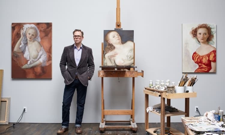 John Currin, một trong số những họa sĩ Mỹ nổi tiếng trong danh sách này, và đã chụp bức ảnh ở trên khi đang vẽ chân dung vợ mình, được biết đến với những bức tranh quyến rũ nhưng cũng không kém phần ấn tượng về những phụ nữ thèm khát. Ông kết hợp giữa cái đẹp và cái kỳ cục, và những ảnh hưởng từ các bức tranh thời Phục Hưng đến các quảng cáo tạp chí từ những năm 50 có thể được tìm thấy trong các tác phẩm thường bị xói mòn của ông. Đó chính là khả năng tạo ra tác phẩm nghệ thuật đương đại bất chấp khẩu vị, khiến bạn vừa ghét vừa yêu, đã giúp Currin trở thành một trong những nghệ sĩ nổi tiếng nhất hiện nay và có thể là một trong những họa sĩ vĩ đại nhất mọi thời đại.