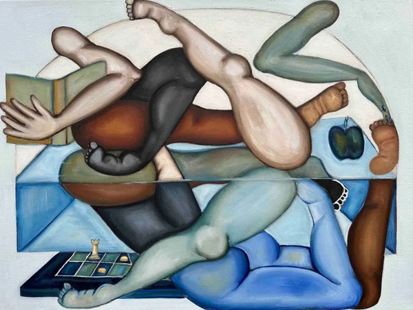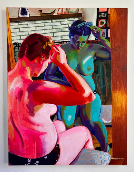 - Đây là một khoảnh khắc đẹp với người bạn đời của tôi, người đã chụp hình tôi khi tôi đang chuẩn bị cho một sự kiện. Bức tranh này nói về sự đối lập nội tâm và chủ nghĩa quan sát, các chủ đề được đại diện bởi các màu sắc khác nhau của hình thể và hình ảnh phản chiếu nó, đồng thời mời người xem tham gia vào bức tranh như một người quan sát của khoảnh khắc cụ thể này. Đối với tôi, việc vẽ là hành động “chậm lại”; như một hoạ sĩ vẽ tượng hình, tôi ghi lại một khoảnh khắc đóng băng trong một bức tranh.
