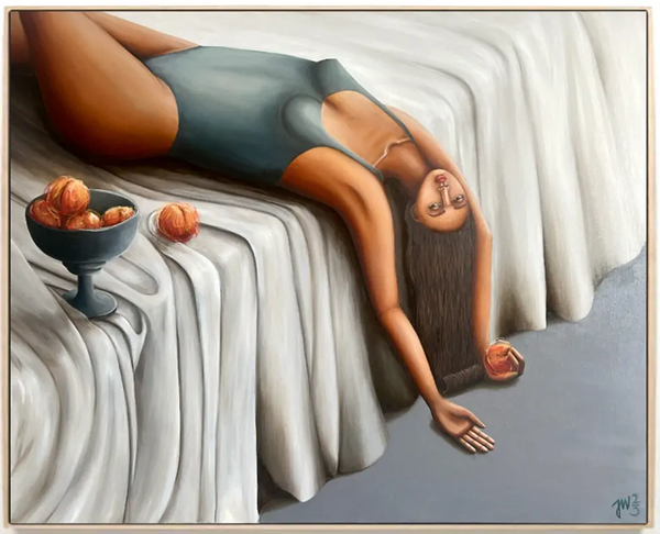 - Tác phẩm này phản ánh một thời điểm khi tôi cảm thấy bị choáng ngợp bởi tất cả những gì đang xảy ra xung quanh tôi, về mặt cá nhân, chính trị và xã hội. Tôi cảm thấy đôi khi cũng cần thiết thậm chí là cấp bách khi phải biết buông bỏ. Trong bức tranh "Đào và Kem", một người phụ nữ nằm trên một cái bàn phủ khăn, thể hiện sự kết hợp giữa tạo dáng, sự cống hiến và sự từ bỏ. Bên cạnh cô là một bát đào, truyền thống liên kết với sự gợi cảm. Tuy nhiên, biểu cảm như búp bê của cô gái gợi ý một cảm xúc sâu sắc hơn, truyền tải cảm giác mệt mỏi hoặc miễn cưỡng, như thể cô đã đạt đến giới hạn của mình mặc dù đang cầm trên tay biểu tượng của sự quyến rũ.