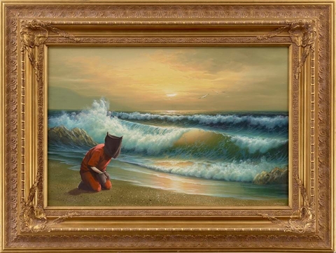 Banksy, tác phẩm Guantanamo, 2006, sơn dầu trên canvas trong. Ảnh: PRUDENCE CUMING ASSOCIATES LTD. THUỘC BẢN QUYỀN CỦA GAGOSIAN
