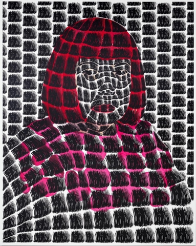 Thomas Bayrle, tác phẩm Yayoi Kusama, 2022, in UV, màu acrylic trên vải lanh, 316 x 250,5 x 4,5 cm ẢNH MARJORIE BRUNET PLAZA. THUỘC BẢN QUYỀN CỦA NEUGERRIEMSCHNEIDER, BERLIN VÀ NGHỆ SĨ