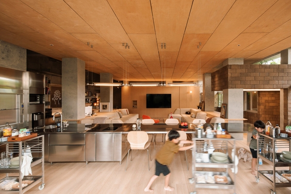 Lối vào chính là một hành lang lát gỗ xuyên qua khu vườn râm mát, dẫn đến hiên đá ngoài trời. Các phòng chức năng như phòng ngủ trẻ em, khu giặt và phòng nhân viên được bố trí bao quanh mép nhà, với cửa trượt mở ra sân vườn, tạo sự kết nối nhẹ nhàng với thiên nhiên.