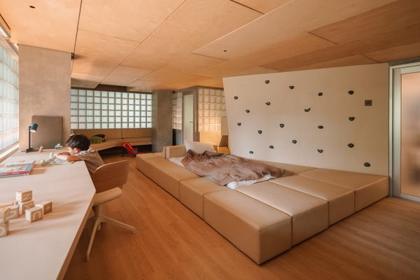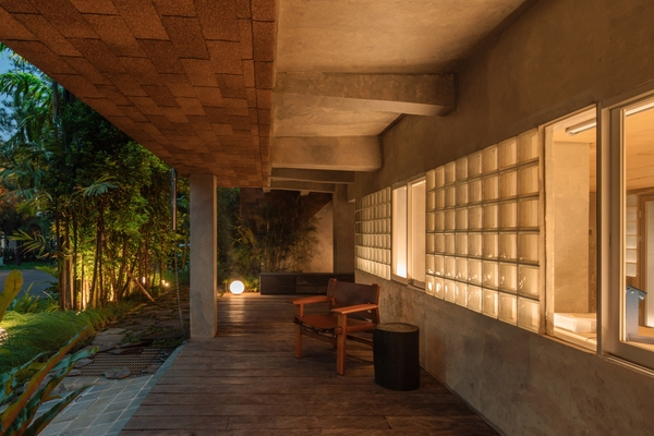 Dự án giữ lại kết cấu bê tông lộ thiên, kết hợp cùng tường gạch, kính khối, sàn đá và trần lót gỗ nguyên bản. Chúng tạo nên một tổng thể mộc mạc, đương đại nhưng không lạnh lẽo — đúng với tinh thần sống linh hoạt, sâu sắc và luôn chuyển động mà kiến trúc sư và chủ nhân cùng theo đuổi.