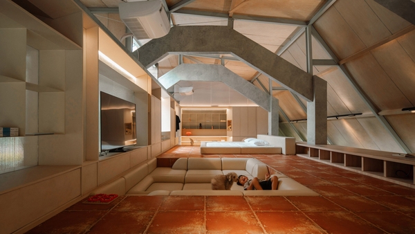 Không gian riêng tư nhất của ngôi nhà — phòng ngủ chính — được đặt trên tầng áp mái, nơi những vì kèo bê tông lớn tạo khung cho các mảng kính và hệ tủ gỗ được bố trí tinh tế. Bên trong, khu vực ngủ và góc ngồi sunken lounge được tổ chức chặt chẽ nhưng vẫn thoáng đạt, mang đến cảm giác ấm cúng, biệt lập mà không bị nặng nề.
