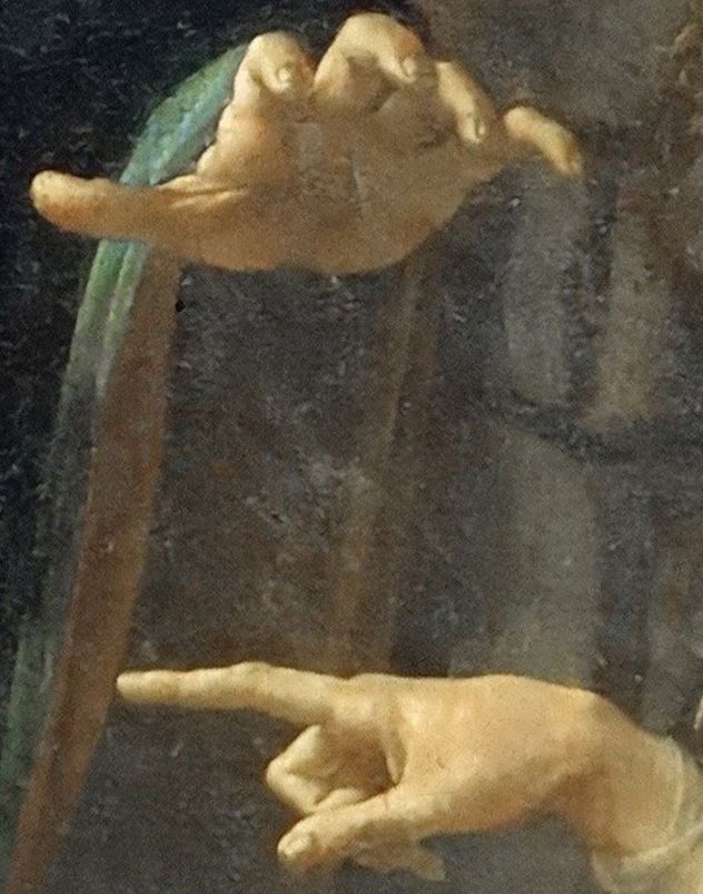 Leonardo đã sử dụng bàn tay tiên đoán hướng tới người quan sát một cách hết sức táo bạo, chẳng hạn như bàn tay của The Virgin of the Rocks tại Louvre (khoảng 1483–1485; xem hình bên trái)