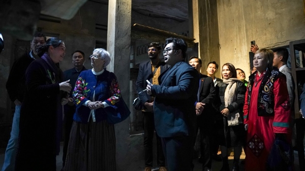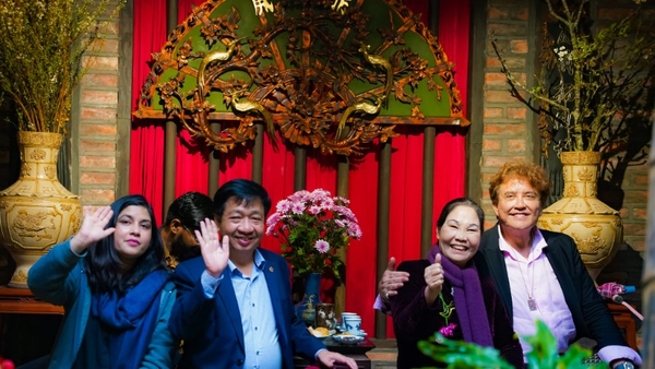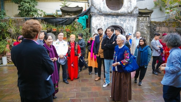 Nghệ nhân Hà Thị Vinh (thứ hai từ trái sang) niềm nở đón tiếp khách tham quan