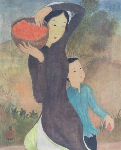 Tác phẩm Mère et Enfant, panier de fruit (Mẹ và con, giỏ trái cây) của Mai Trung Thứ. Ảnh được chụp từ triển lãm