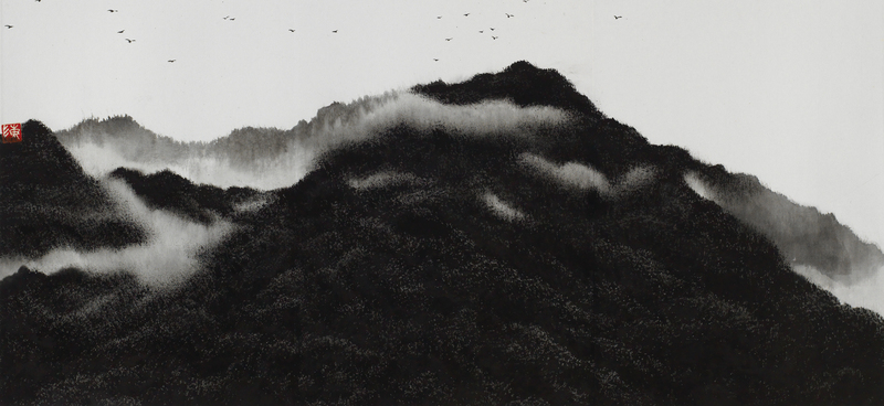 Trong bức tranh Quan Sát Sương Mù của Trần, các sắc thái mực khác nhau, được xếp lớp và pha trộn, tạo nên một cảnh núi hùng vĩ giữa làn sương mỏng manh. Những chú chim rải rác trên bầu trời mang đến cảm giác yên bình cho bức tranh, như thể truyền tải bản chất của lời Trang Tử, “Trời và Đất có vẻ đẹp tuyệt vời, nhưng vẫn im lặng.”