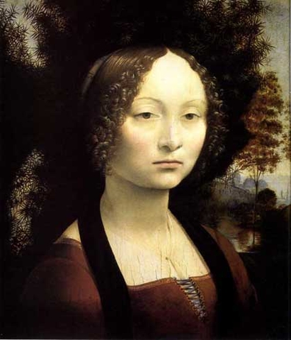 Ginevra de' Benci, sơn dầu trên bảng gỗ 1476. Bảo tàng Nghệ thuật Quốc gia Washington 42x37cm.