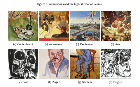 ( This figure shows the paintings with the highest emotion scores among 79,860 annotated artworks, by emotion (amusement, anger, awe, contentment, disgust, excitement, fear, sadness, and other—not shown)