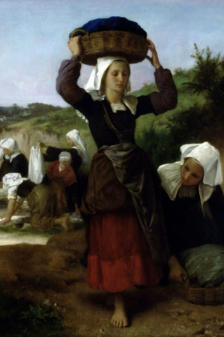( William-Adolphe Bouguereau’s French washerwoman (1855) depicts a woman carrying a basket of clothes while other woman scrub their whites by a stream )