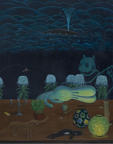 Tác phẩm “Chú mèo ngủ như con người và chú thỏ ngủ như mèo” của Atsushi Kaga, sử dụng sơn Acrylic và lá vàng giả trên vải.