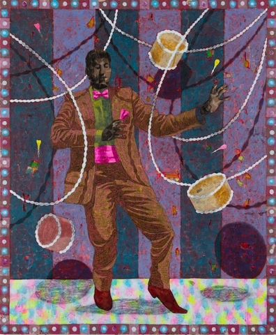 Tác phẩm “Người làm bánh” của Derek Fordjour, được vẽ bằng than, bìa cứng, sơn dầu, phấn màu và giấy bạc trên báo gắn vào tranh vải