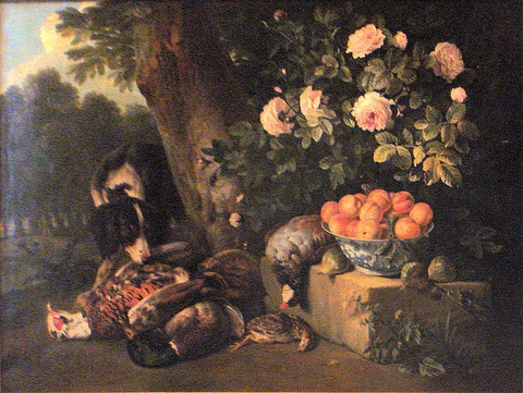 Tĩnh vật với trò chơi mặc quần áo, thịt và trái cây, sơn dầu của Alexandre-François Desportes, 1734; trong Phòng trưng bày Nghệ thuật Quốc gia, Washington, D.C. 121 × 95 cm.