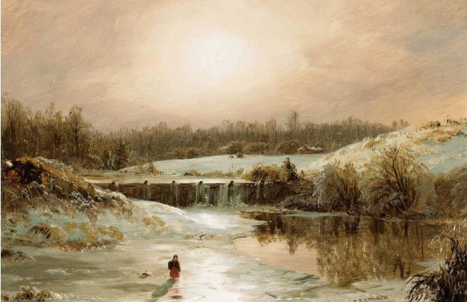 Từ nước Đức Lãng mạn sang bờ Đông Hoa Kỳ, họa sĩ Frederic Edwin Church của Trường phái Sông Hudson đã đưa phong cảnh tuyết vào ngữ cảnh Mỹ – rộng mở, hùng vĩ, và mang đậm tinh thần khai phá.