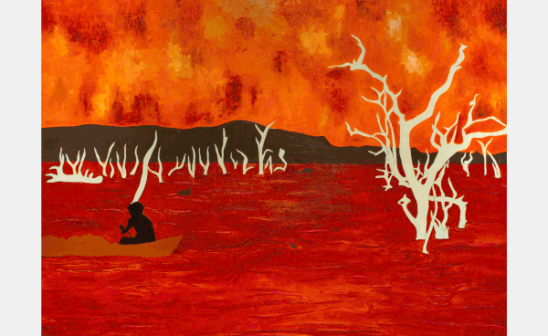 Tác phẩm mang tên What Are You Doing by My Sea? – câu hỏi gợi cảm giác xung đột và chiếm hữu. Trên ô kính, một đàn chim lao qua bầu trời vàng rực. Bên cạnh, nhân vật nữ đứng quay mặt ra biển, xa rời ánh nhìn của người xem. Phía dưới, khuôn mặt nam giới bị cắt nửa, gợi đến hình ảnh một cái đầu lìa khỏi thân. “Có một mâu thuẫn nằm ở trung tâm tác phẩm, nhưng tất cả xuất phát từ trái tim,” cô nói. “Người phụ nữ ấy dường như đã trải qua một vết thương tình cảm.”