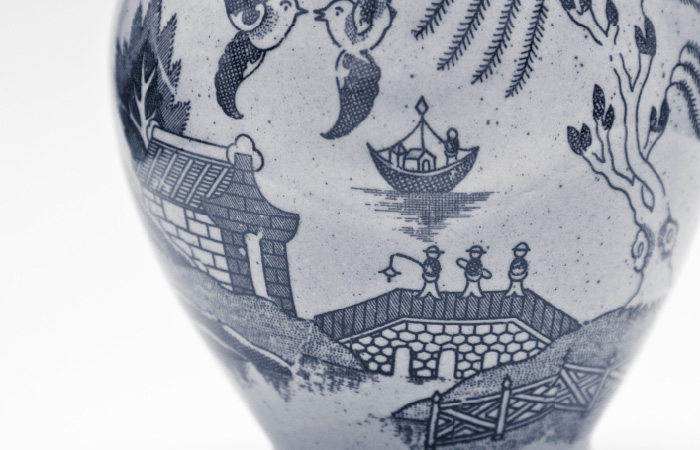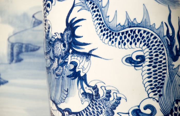 Đồ sứ Trung Quốc, đặc biệt là loại men lam – trắng, đóng vai trò trung tâm trong việc hình thành thẩm mỹ Chinoiserie. Kiểu trang trí này, vốn được hoàn thiện dưới thời nhà Nguyên tại các lò gốm ở Cảnh Đức Trấn – “Thủ đô sứ” của Trung Hoa – đã làm say lòng giới thượng lưu châu Âu. Màu xanh coban dưới lớp men trắng trở thành biểu tượng thẩm mỹ vượt thời gian, được sao chép và diễn giải lại trên nhiều chất liệu phương Tây.