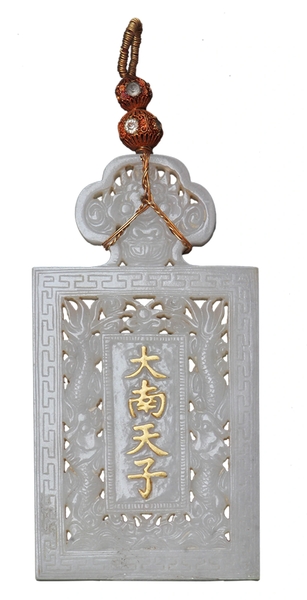 Mặt trước thẻ bài của vua Khải Định khắc nổi dòng chữ Hán nạm vàng “Đại Nam thiên tử”