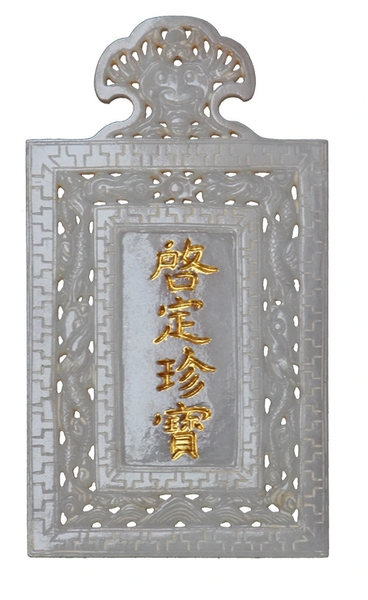 Mặt sau thẻ bài của Từ Cung Hoàng Thái hậu khắc nổi dòng chữ Hán nạm vàng “Khải Định trân bảo”