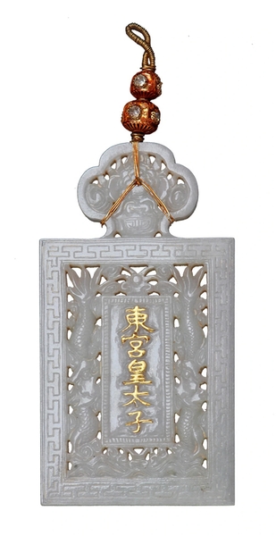 Mặt trước thẻ bài của hoàng thái tử Vĩnh Thụy khắc nổi dòng chữ Hán nạm vàng “Đông cung hoàng thái tử”