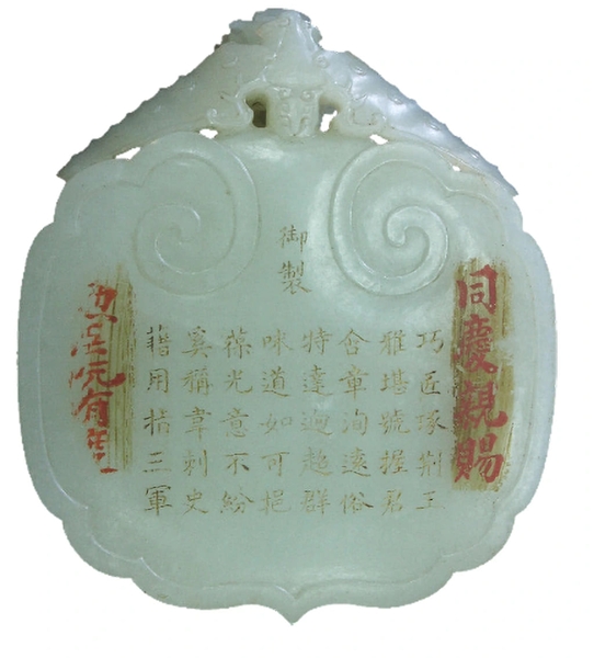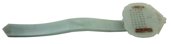Trên bề mặt hốt ngọc khắc bài thơ bằng chữ Hán, gồm tám dòng, mỗi dòng năm chữ, với đường nét tinh xảo, sắc sảo. Đây là bài thơ ngự chế của vua Càn Long (Trung Quốc), ca ngợi ngọc quý như bảo vật đại diện cho nhà vua, có thể thay mặt thiên tử phát lệnh, nắm giữ binh quyền nơi chiến trường.