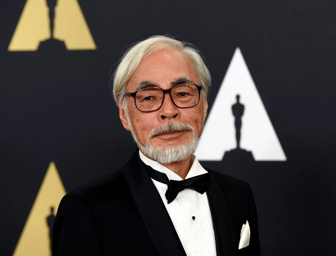 Đạo diễn phim và họa sĩ hoạt hình người Nhật Hayao Miyazaki tạo dáng tại Lễ trao giải thưởng của Viện Hàn lâm Khoa học và Nghệ thuật Điện ảnh ở Los Angeles, California, năm 2014.