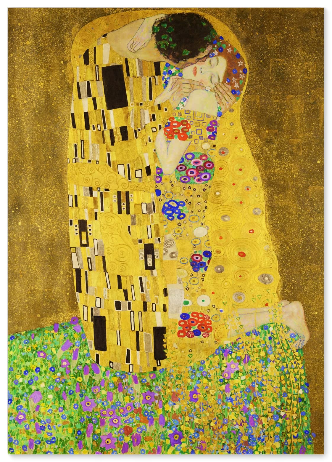 Giống nhiều tác phẩm khác của ông, “The Kiss” mang sắc thái gợi cảm rõ rệt, nhưng cũng đầy dịu dàng. Lấy cảm hứng từ tranh khảm Nhật Bản và tình yêu lãng mạn mang tính phổ quát, bức tranh sử dụng lá vàng đặc trưng một cách choáng ngợp.