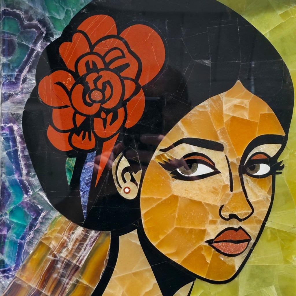 Mỗi loại đá được lựa chọn không chỉ vì màu sắc, mà vì đặc tính năng lượng. Cấu trúc tổng thể vận hành như một dòng chảy liên tục, nơi ánh sáng được giữ lại, phản xạ và khuếch tán trên bề mặt epoxy trong suốt. Woman in Red Bow không chỉ là một mosaic, mà là một không gian cảm nhận – nơi hình ảnh và vật chất hòa vào nhau.