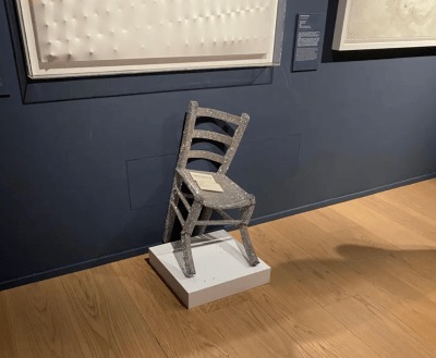 Tuy nhìn có vẻ chắc chắn nhưng thực tế chiếc ghế chỉ là một tác phẩm điêu khắc hiện đại rỗng ruột, cấu tạo từ lớp kim loại mỏng và dán bạc. Có bảng cảnh báo không chạm vào và ghế được đặt trên bục cao – một tín hiệu rõ ràng rằng đây không phải ghế thật để sử dụng.