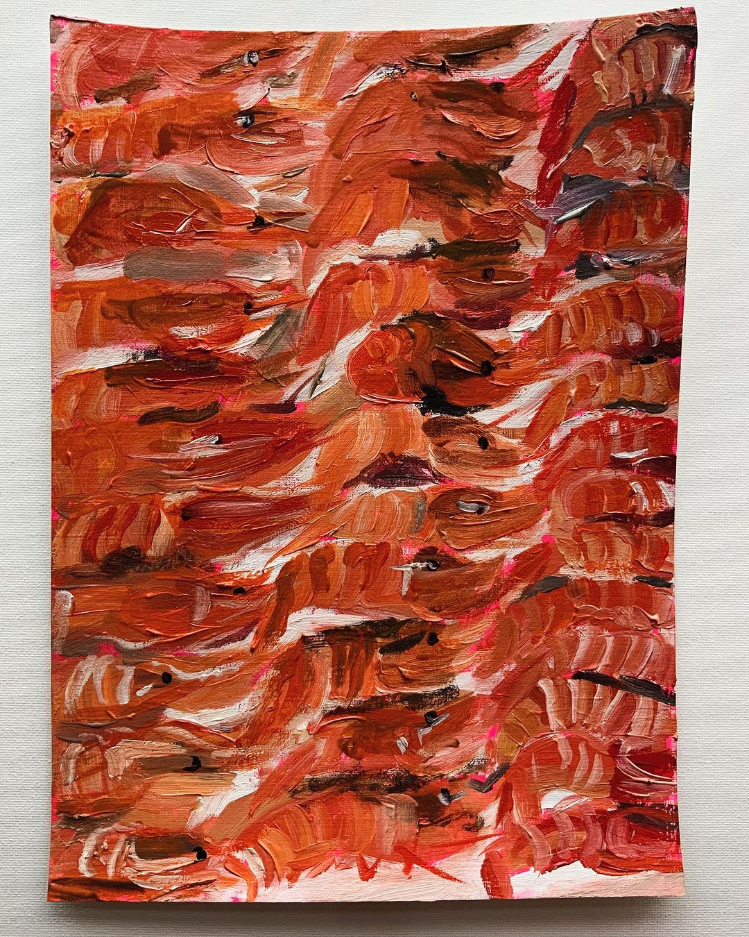 Có món ăn yêu thích nào không? Bạn thích ngắm nhìn những bữa tiệc buffet đầy màu sắc? Tại sao không thử vẽ những tác phẩm nghệ thuật sống động với chủ đề ẩm thực? Những gam màu rực rỡ của tôm (hay tôm sú tùy theo cách gọi) là một lựa chọn tuyệt vời để khám phá sự phong phú của sắc tố sơn dầu. Bạn có thể tạo ra một họa tiết lặp lại như nghệ sĩ này hoặc đi sâu vào từng chi tiết với phong cách tĩnh vật.