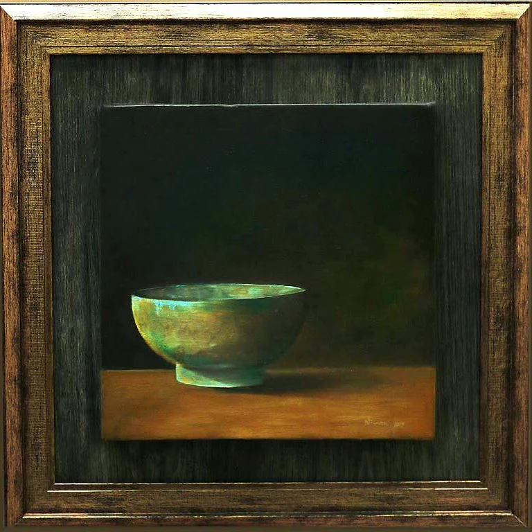 Hãy nhìn ngắm thế giới xung quanh và biến những điều bình dị thành tác phẩm nghệ thuật! Trong bức tranh này, nghệ sĩ đã tận dụng các sắc độ khác nhau, đường nét mềm mại của một chiếc bát xanh đơn giản để tạo nên một tác phẩm ấn tượng. Sự tương phản đậm nét và bóng đổ giúp bức tranh trở nên đầy kịch tính và cuốn hút.
