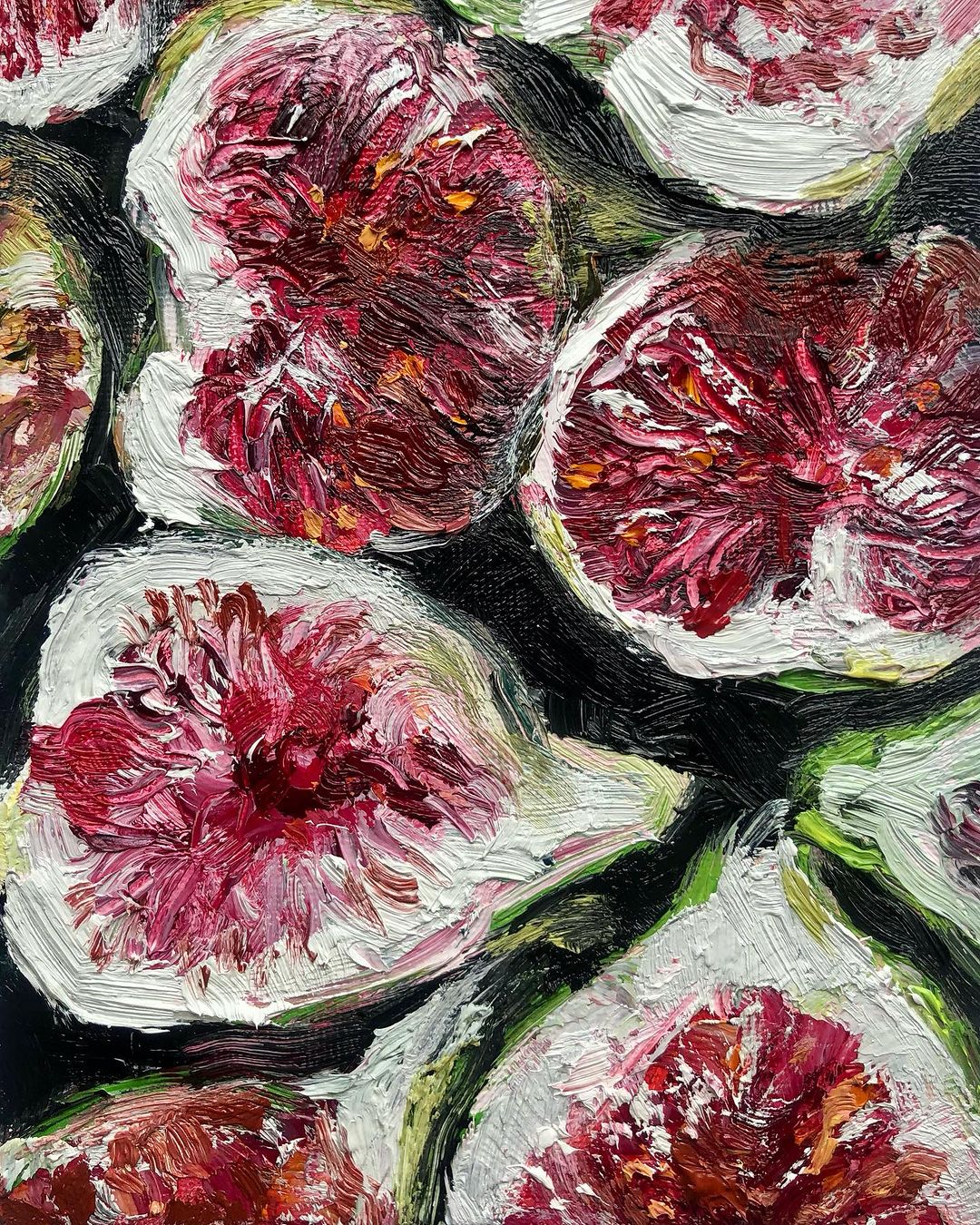 Đã bao giờ bạn nhìn một bức tranh mà chỉ muốn… ăn nó chưa? Chúng tôi cũng vậy! Hãy tiếp cận chủ đề hoa quả theo cách mới – cận cảnh và đầy táo bạo! Nghệ sĩ này đã sử dụng kết cấu và lớp màu sắc để khiến những quả sung trở thành một bữa tiệc thị giác. Bạn có thể áp dụng cách bố cục này với nhiều phong cách và kỹ thuật khác nhau.