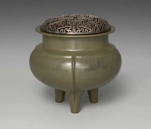 Hai nyoi (ruyi trong tiếng Trung) nhỏ đúc bằng đất sét ở hai bên nắp dùng làm chỗ để tay cầm. Để hoàn thiện thiết kế, phần trên của cây trượng nyoi giống với chiếc mũ cong của reishi (nấm cách điệu). Những quyền trượng như vậy được tưởng tượng là nằm trong tay của các nhà hiền triết, các vị tiên Đạo giáo hoặc các vị thần Phật giáo và ám chỉ những hoàn cảnh thuận lợi.