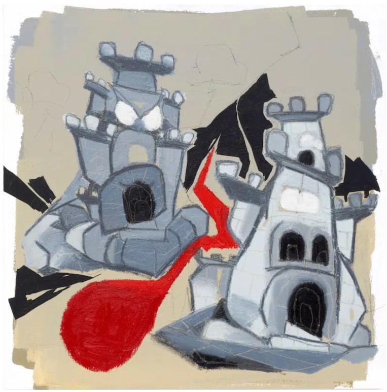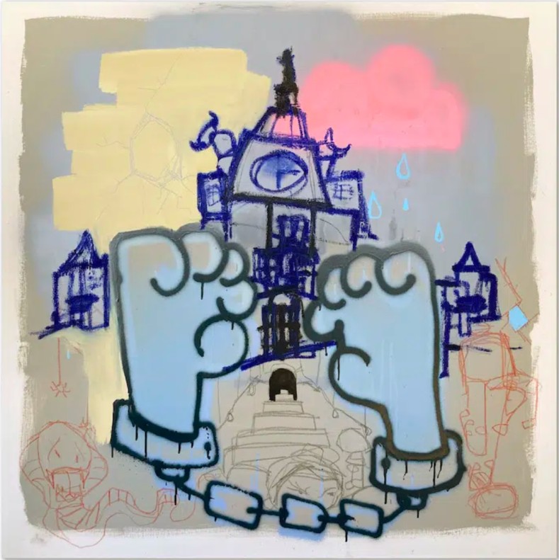 Không có gì ngạc nhiên khi chủ đề sinh tồn đóng vai trò trung tâm trong nghệ thuật của GREY – được thể hiện bằng chuyển động bùng nổ và năng lượng sống động. Ngay cả trong những bức tranh hỗn loạn nhất, u tối nhất, vẫn le lói một niềm hy vọng – lan tỏa qua gam màu tươi sáng, những đường nét dịu dàng, và chữ viết xoáy tròn của anh. Gần đây, lâu đài xuất hiện thường xuyên như một biểu tượng ẩn dụ – với các đặc điểm kiến trúc được nhân hóa thành gương mặt nhăn nhó và đẫm nước mắt. Những cấu trúc đồ sộ này gợi lên sự giằng xé giữa ổn định và vô gia cư, đồng thời phản ánh tội lỗi tập thể trong cuộc khủng hoảng nhà ở hiện nay.