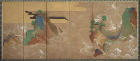 Waves, có lẽ được hình thành sau này, là một cảnh biển hùng vĩ với những con sóng giống như núi độc đáo bằng vàng và mực sumi , tạo thành một mô hình 'nghìn con sóng' với các xoáy nước và đỉnh sóng. Mặc dù cách mô tả sóng chịu ảnh hưởng của hội họa nhà Minh, các chủ đề Nhật Bản được kết hợp bao gồm kizui 'điềm lành', hoặc 'sự kiện kỳ diệu', thường thấy trong hội họa truyền thống về đại dương. Các yếu tố gợi ý về cõi bất tử cũng được mượn từ hamamatsu zu byobu , thể loại 'bình phong bờ thông' có niên đại từ thời Muromachi (1333-1568) đến thời Momoyama (1568-1615).