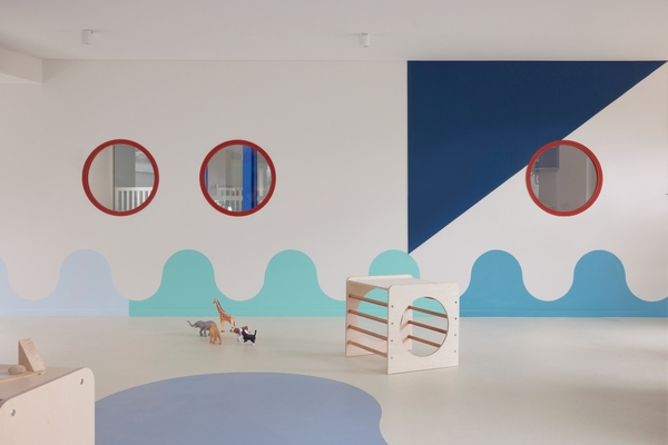 Brustman sử dụng những mảng tường vẽ tay, sàn marmoleum in hình sóng biển, mây trời, cùng ánh sáng tự nhiên qua cửa sổ vòm và giếng trời tròn – tất cả cùng tạo nên một không gian học tập linh hoạt mà vẫn liền mạch, thơ mộng mà vẫn mạch lạc.