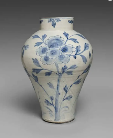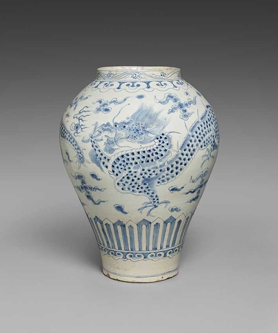 Bằng cách làm nổi bật các họa tiết và màu sắc, bài thuyết trình này khám phá cách nghệ thuật Hàn Quốc bắt nguồn một cách sống động và đưa ra các mã giao tiếp mạnh mẽ, ví dụ, hoa mẫu đơn tượng trưng cho sự thịnh vượng và con rồng huyền thoại có khả năng tạo ra mưa. Một chiếc bình trong triển lãm có hình ảnh uốn lượn của một con rồng bay qua những đám mây để bắt một viên ngọc trai rực lửa, ban điều ước được gọi là cintamani . Trong cung điện, loại bình rồng ngắn hơn được sử dụng để đựng rượu, loại cao, như chiếc này, được dùng để đựng một bó hoa.