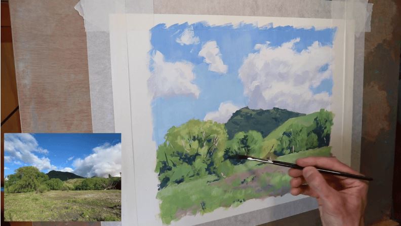 Bầu trời và mây được xử lý đầu tiên vì đây là những yếu tố xa nhất trong cảnh. Phương pháp này cho phép thiết lập bầu không khí và tông màu chung của bức tranh ngay từ đầu.
