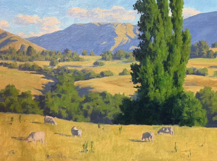 Những đường nét nhẹ nhàng mô phỏng thân và cành cây dương Lombardy được bổ sung, cùng với một số điểm sáng trên con cừu và vài chi tiết tinh tế khác trên bãi cỏ, tạo nên sự cân bằng và hoàn chỉnh cho bức tranh.