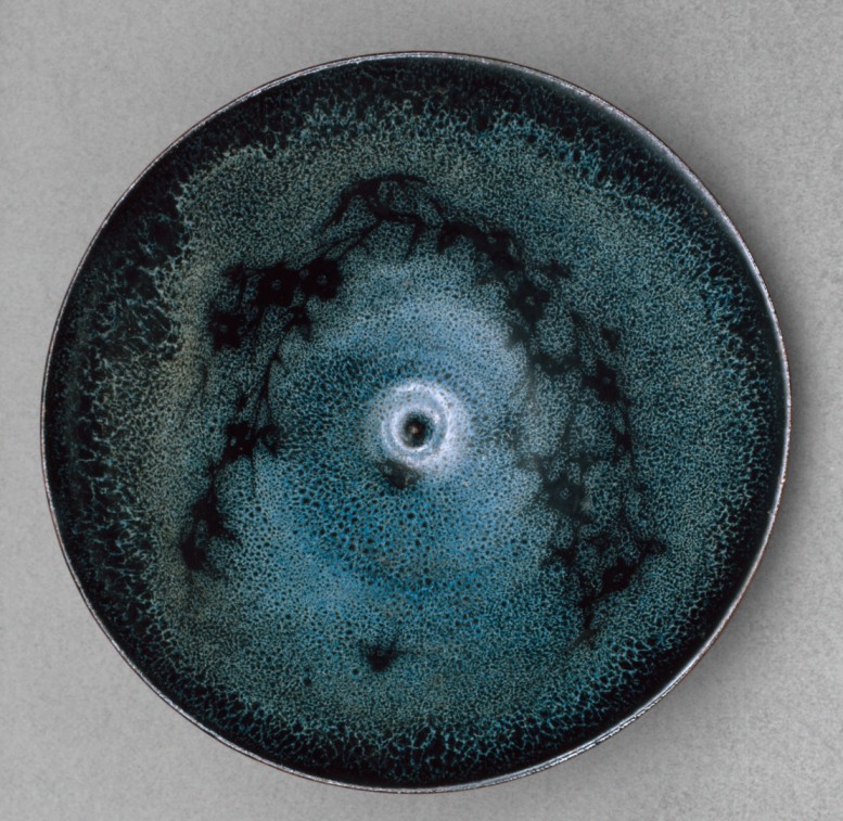Màu xanh lam rực rỡ, loang lổ trên chiếc bát này là một hiện tượng hiếm gặp – sản phẩm tình cờ của quá trình nung, khi lớp men giàu sắt phản ứng với tro tre hoặc gỗ. Hiệu ứng độc đáo này không chỉ là kỹ thuật tráng men mà còn là biểu hiện thăng hoa của sự tương tác giữa vật liệu và yếu tố tự nhiên. Họa tiết hoa mận nở, được tạo từ khuôn giấy carbon hóa, mang ý nghĩa tượng trưng cho sự hồi sinh, thanh lọc và kiên định – phẩm chất được kính trọng trong văn hóa Trung Hoa. Mặc dù bị gạt khỏi triều đình do đặc tính thô của đất sét, đồ gốm Jizhou lại được các học giả và giới tu hành ở Trung Quốc và Nhật Bản nâng niu, đặc biệt là trong các nghi thức trà đạo, nơi cái đẹp tinh tế và tính vô thường được tôn vinh.