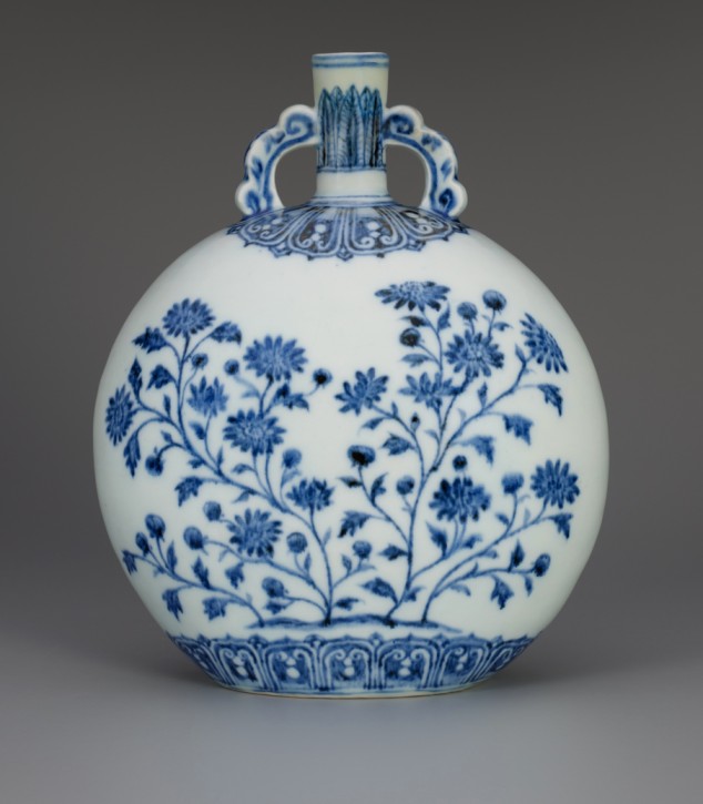 Hình dáng bầu dẹt và quai đôi của chiếc bình nguyệt này lấy cảm hứng từ bình đựng nước di động – vật dụng gắn bó với các thương nhân và tín đồ hành hương dọc theo Con đường Tơ lụa. Được mô phỏng lại bằng đồ sứ, thiết kế sử dụng oxit coban – sắc tố phổ biến trên gốm Hồi giáo – nhưng lại thể hiện rõ mỹ cảm Trung Hoa: các nhánh hoa cúc và hoa cẩm chướng bay lượn tự do trên nền trắng. Không còn dày đặc và rối rắm như các thiết kế cùng thời, bố cục của chiếc bình này mang tinh thần thoáng đãng, thanh lịch, phản ánh sự thấu hiểu về khoảng trống và sự tối giản. Điều thú vị là mẫu thiết kế gần như duy nhất này lại được tìm thấy trong bộ sưu tập hoàng gia Ottoman, cho thấy sự đánh giá cao xuyên văn hóa đối với vẻ đẹp vượt thời gian.