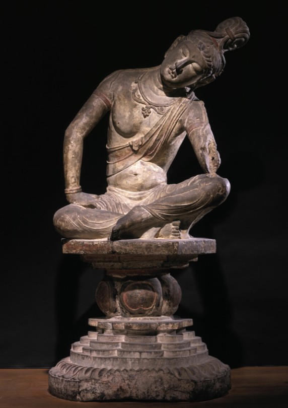 Tượng bồ tát này là một trong những hiện thân cảm động nhất của tinh thần thiền định trong nghệ thuật Phật giáo Trung Hoa. Với ánh mắt nhắm hờ, thân mình nghiêng nhẹ, đầu tựa tay (giờ đã mất), hình tượng gợi nên cảm giác từ bi sâu thẳm và sự hòa hợp nội tâm. Những chi tiết sắc nét ở vòng cổ tương phản với đường nét mềm mại của cơ thể, tạo nên một tổng thể vừa quyến rũ vừa linh thiêng. Các bức tượng Phật và bồ tát thường đi theo bộ ba: trung tâm là Di Lặc, hai bên là những người dẫn đường trong hành trình tu tập. Bức tượng này, dù đã mất một phần, vẫn gợi nhắc đến một thế giới tâm linh đầy thanh bình đang dần tàn phai theo thời gian.
