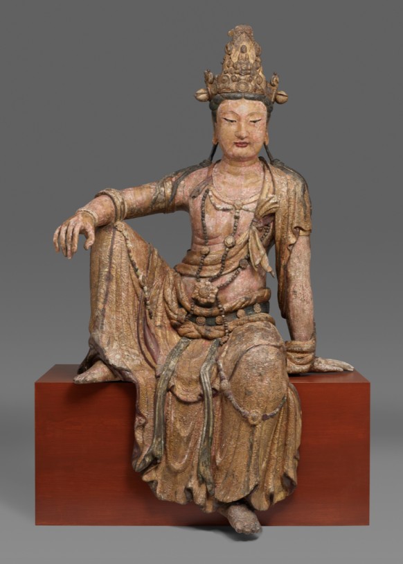 Guanyin – hiện thân lòng từ bi của Avalokiteshvara – xuất hiện ở đây trong tư thế “vương giả thoải mái”, một biểu tượng điêu khắc vay mượn từ Ấn Độ, nhưng đã được biến chuyển thành đặc trưng điêu khắc Phật giáo Trung Hoa. Một chân buông thõng, tay chống đầu gối, gương mặt an tĩnh – toàn thân toát lên sự gần gũi nhưng đầy uy nghi. Ban đầu được sơn với màu da tự nhiên, vải màu xanh lam và lục, sau được dát vàng dưới thời Minh, bức tượng này không chỉ là đối tượng thờ phụng mà còn là hiện thân của lý tưởng thẩm mỹ thời Tống: nhân văn, duyên dáng, sâu sắc trong từng chi tiết. Đây là điểm giao thoa giữa tín ngưỡng, nghệ thuật điêu khắc và tư tưởng đạo đức, cho thấy sự phát triển vượt bậc trong nghệ thuật Phật giáo đương thời.