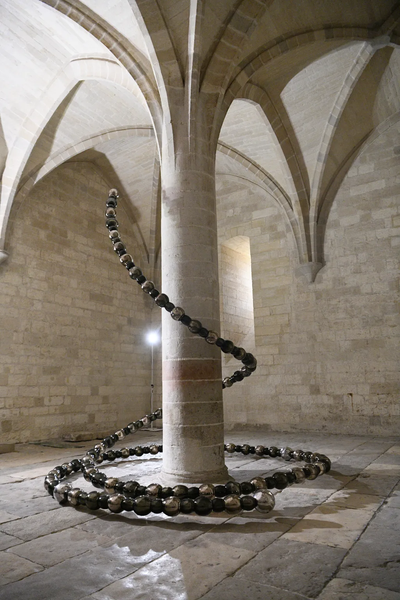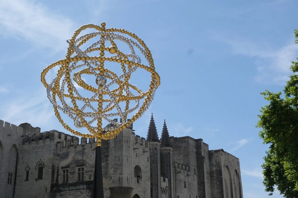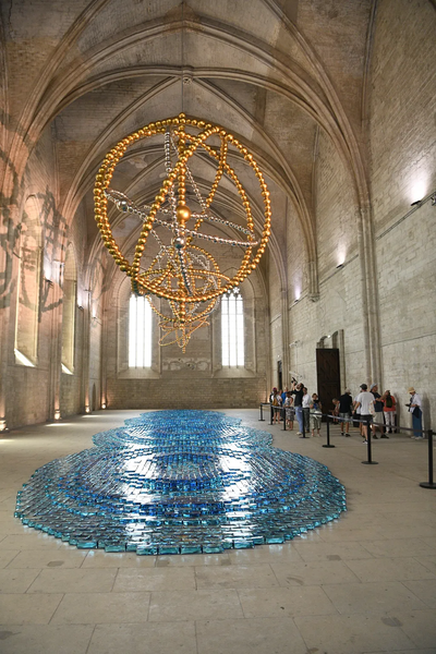 Trung tâm của sự kiện nghệ thuật này là Palais des Papes, cung điện đồ sộ từng là trung tâm Công giáo thế kỷ 14. Othoniel sắp đặt 133 tác phẩm tại đây: tượng thủy tinh treo gợi hình chòm sao, đài phun bằng thủy tinh và vàng trong vườn cổ, khối thép “Yardang” như cột cát giữa bão sa mạc, 60 bức tranh mực trên nền vàng, cùng “ngôi mộ tình yêu” phủ gạch xanh lam ánh sáng. Đặc biệt, bốn khối cầu “Cosmos” bằng thép mạ vàng, mỗi khối đường kính 5m, được treo trong Đại nguyện đường nhờ hệ thống kết cấu kim loại ẩn phía trên trần vòm.