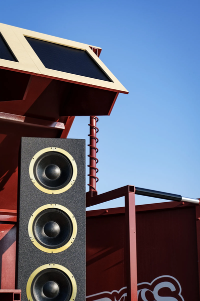 Tác phẩm được chế tác cùng xưởng Matchless Builds (Portland, Oregon): khung thép phủ sơn tĩnh điện, cửa gỗ mở ra hệ thống loa bằng gỗ ép dày, vừa chống chịu thời tiết vừa đủ chắc để trở thành chỗ ngồi. Hệ thống âm thanh hiện đại tích hợp cả dây dẫn lẫn Bluetooth.