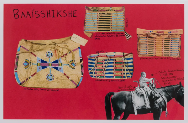 Wendy Red Star, From Set F: iichíilishihche datchípeetaaliche (martingale); iíttaashteeuuxe (buckskin dress); baleiipáhpaatbaalo (beaded belt) và bálaaisshe (purse); baaísshikshe (saddle bag), 2023. (Hình ảnh: Tư liệu nghệ sĩ và Bộ sưu tập Miller Meigs).